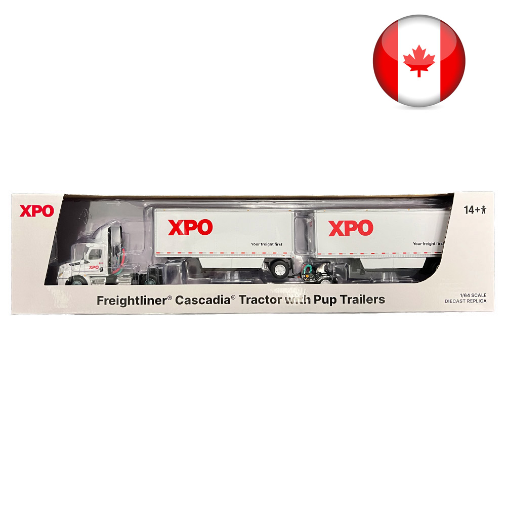 Freightliner Cascadia 1:64 scale die-cast truck is loaded with many intricate details inside and out. Features include a heavy-duty metal construction, turning front wheels, open hood, realistic airbrake hoses, and two removable trailers. Screened XPO logo and graphics (including US flag on driver door). 14" in length (fully assembled). Not intended for children under the age of 14.